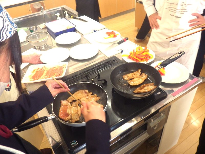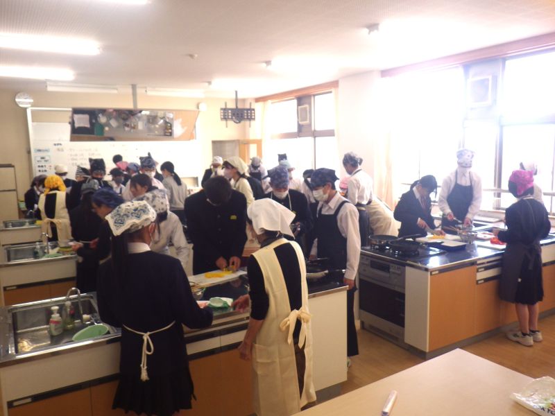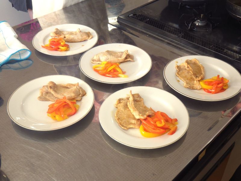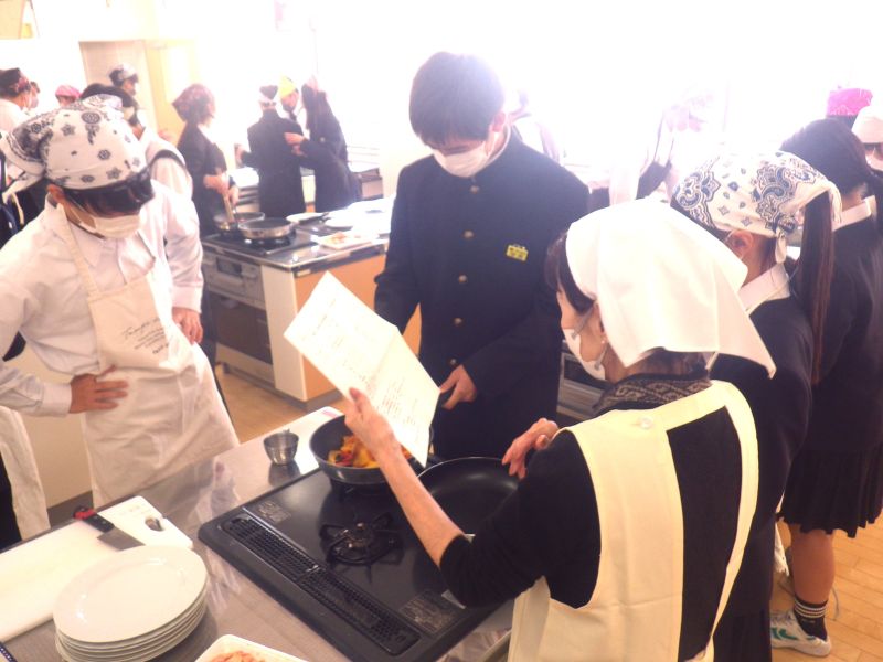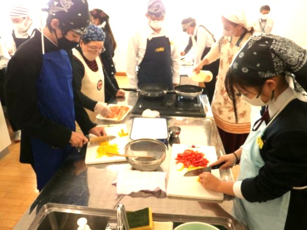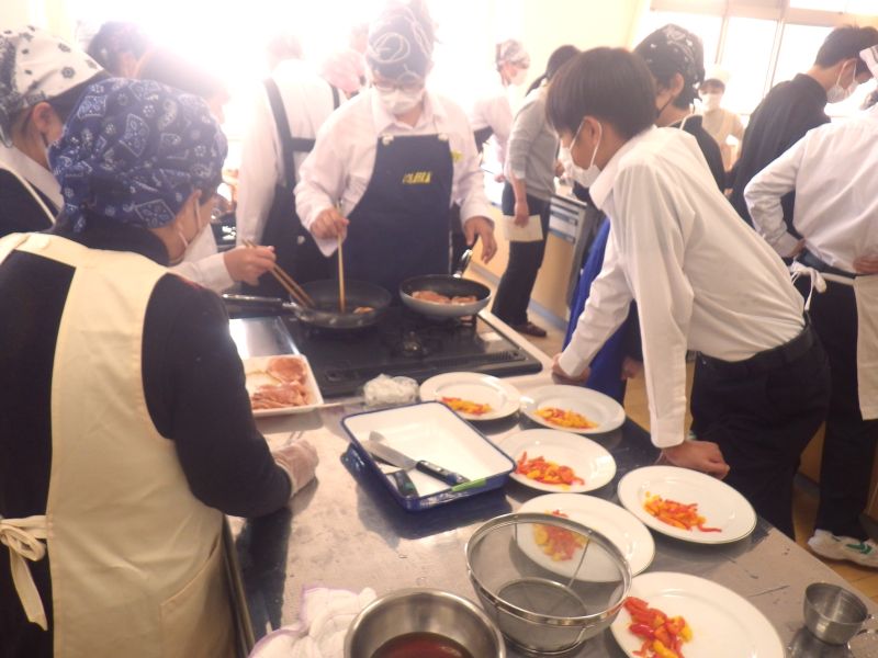 今回は、色鮮やかなパプリカを添えて、豚肉の生姜焼きを作りました。生徒は、奉仕団の皆さんからご助言・ご指導をいただきながら調理をすすめ、手際よくおいしい生姜焼きを完成させることができました。ご協力ありがとうございました。