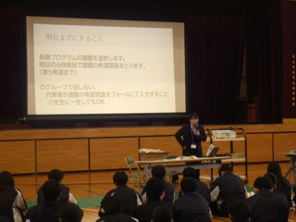総合的な学習の時間の一環として、モリーブに関係する方々の助言や協力を受けながら、地元の課題について理解を深め、課題解決に向けた探究的な学習を2年生から3年生にかけて行います。