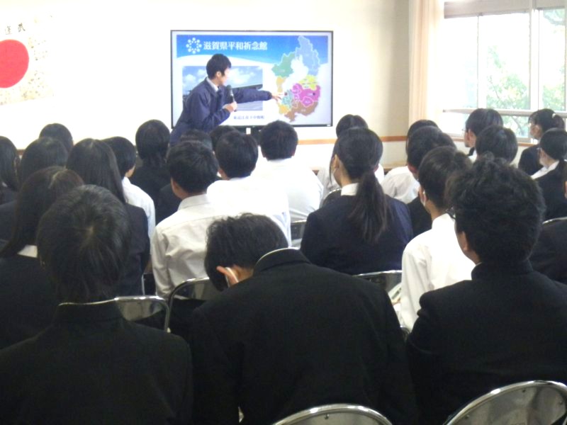 滋賀県平和祈念館より講師をお招きし、戦時中の徴兵についてや、当時中学生で戦地に赴いた方の話、守山で空襲にあった方の話を動画で見せていただきました。