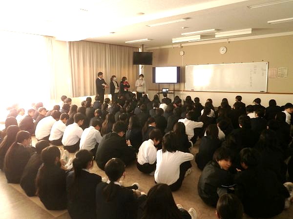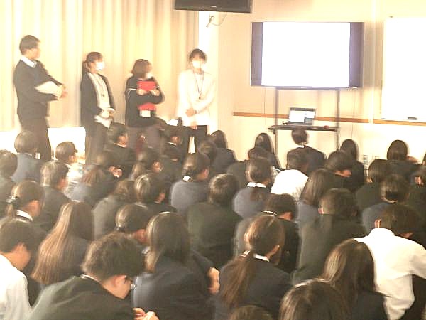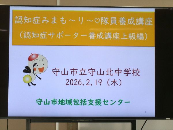 地域包括支援センターの職員の方々を講師としてお招きし、中学生が認知症を正しく理解し、認知症の人や家族を温かく見守ることの大切さを知るとともに、認知症サポーターとして、具体的にどのような関わりができるかについて学びました。